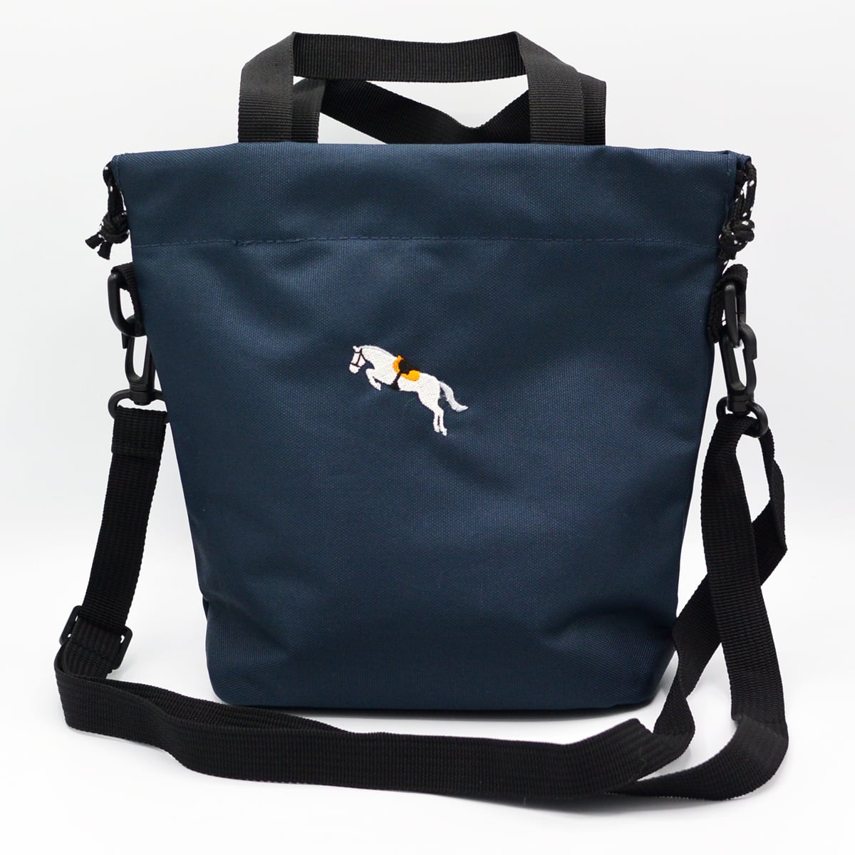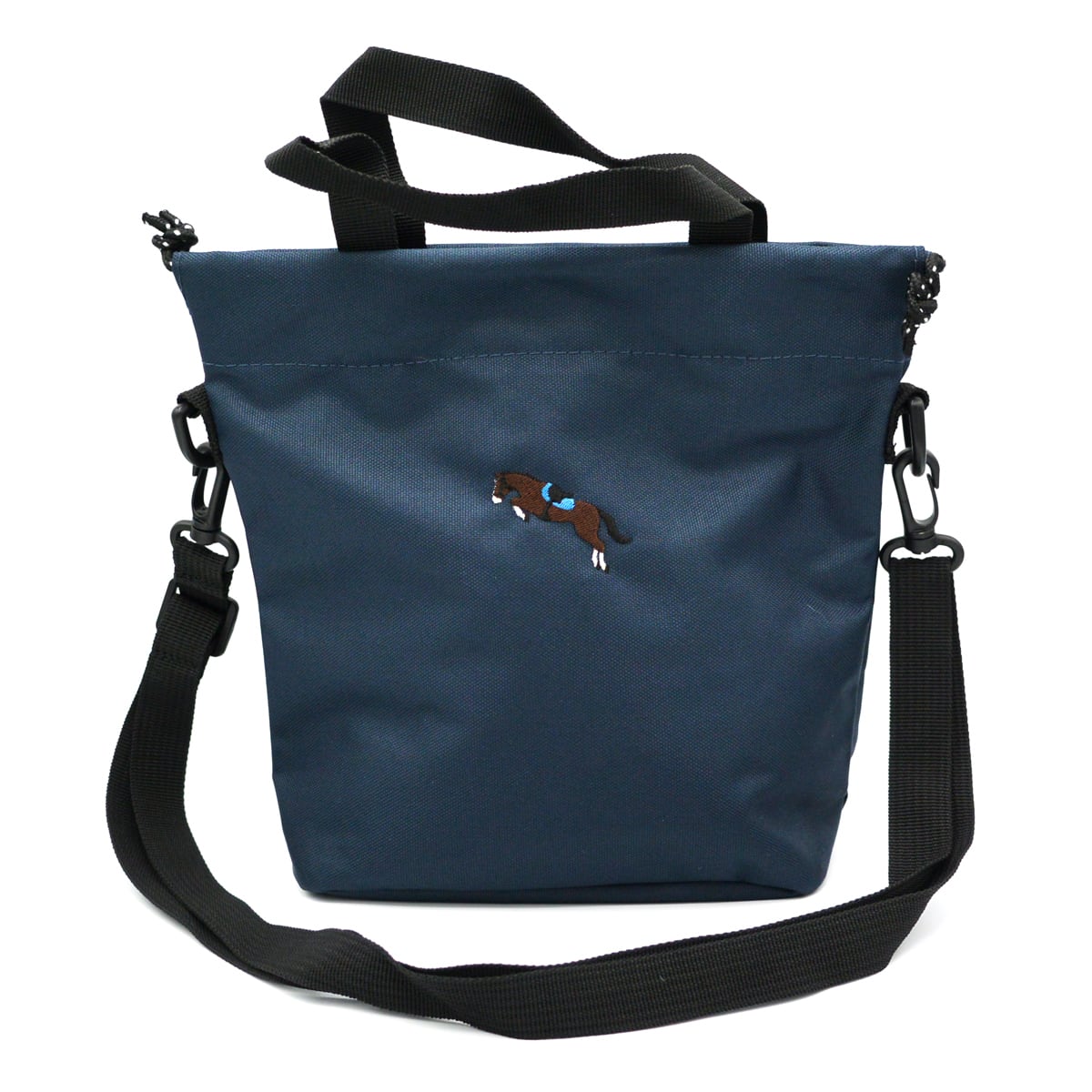 再生ポリエステルを使用した巾着にもなるお手軽サイズのショルダーバッグに障害飛越の馬を刺繍しました。