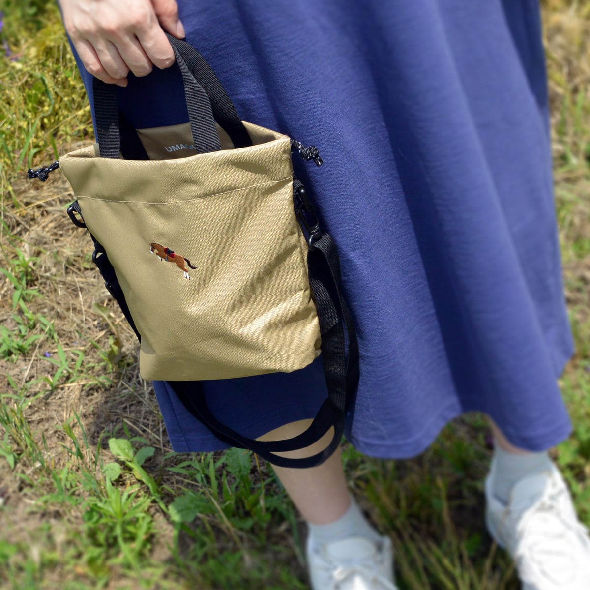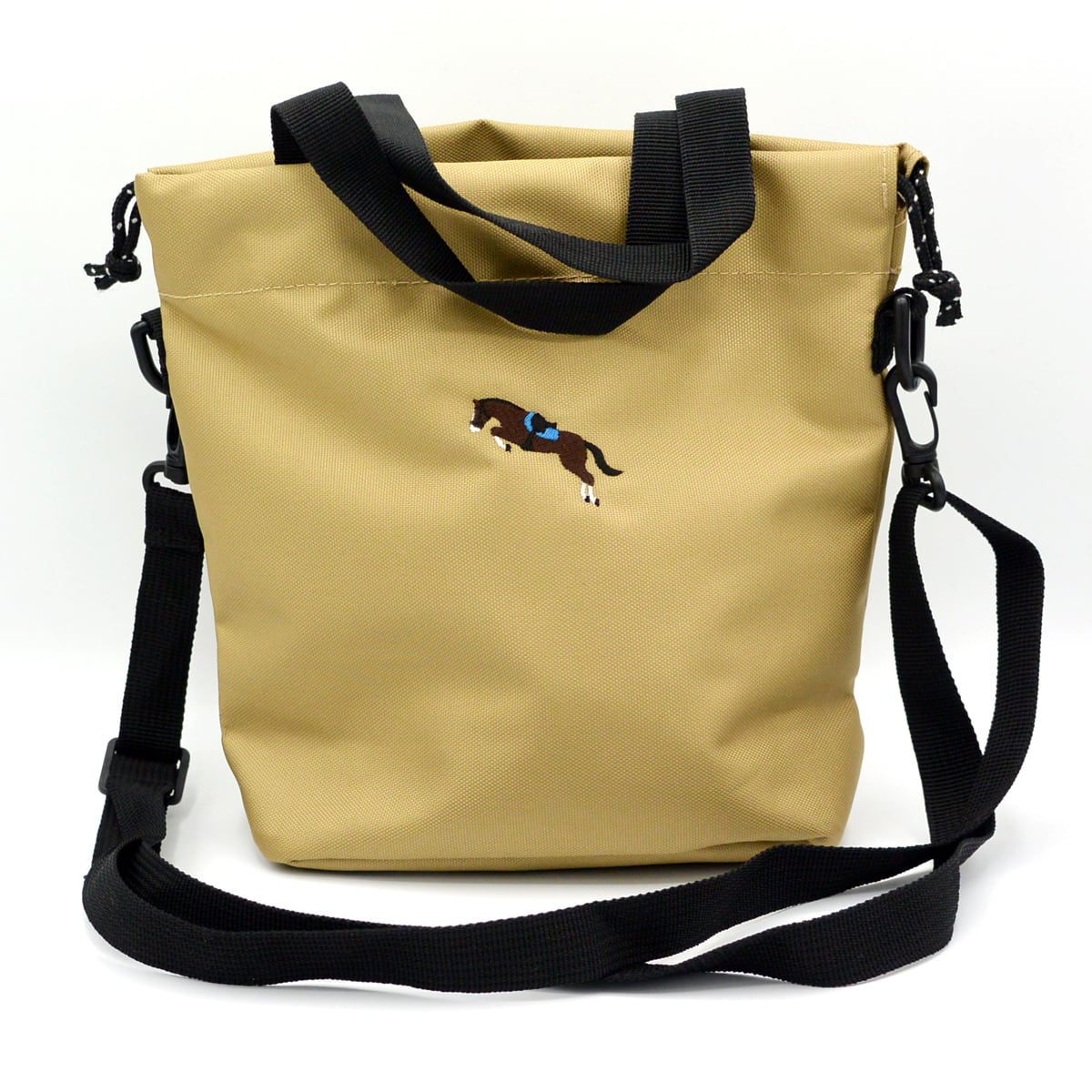 再生ポリエステルを使用した巾着にもなるお手軽サイズのショルダーバッグに障害飛越の馬を刺繍しました。