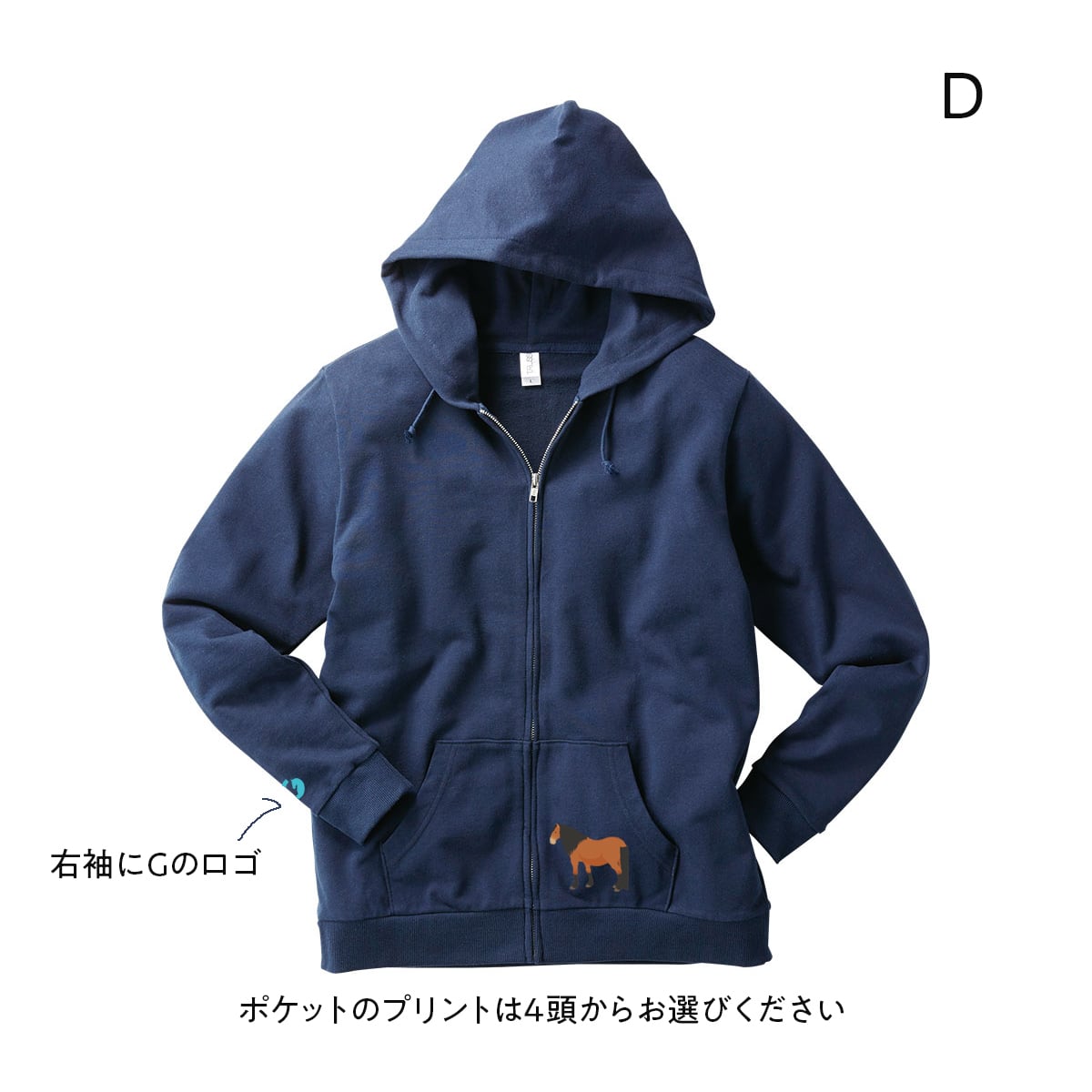 フロントポケットのプリントは4頭の馬たちからお好きな1頭をお選びください。